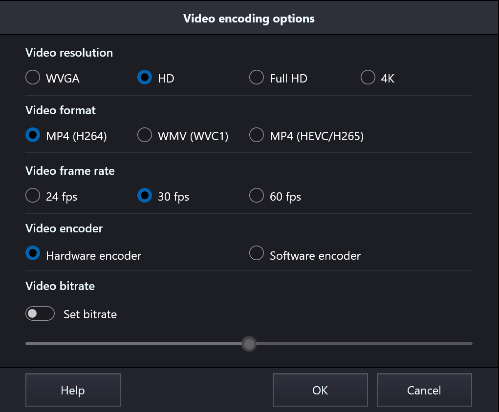 This is the resolution of the output video file. There are four options: WVGA (854x480), HD (1280x720), Full HD (1920x1080), and 4K (3840x2160).