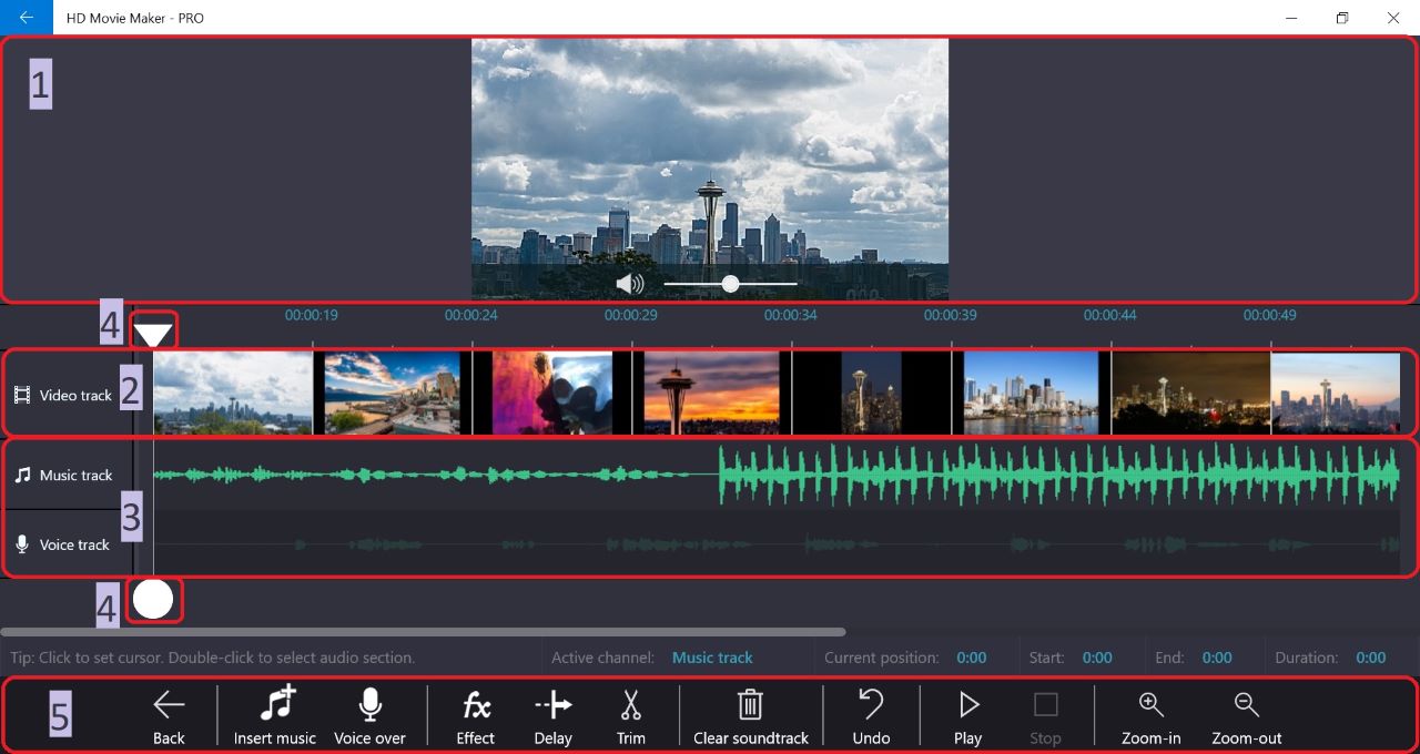 The Sountrack editor is used to add and edit background music and voiceover in your project
