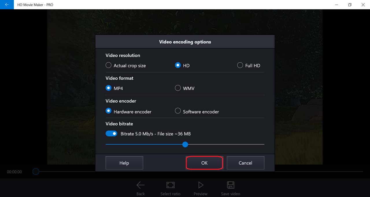Select output movie settings, then press OK.